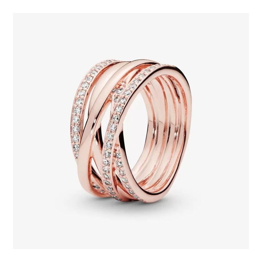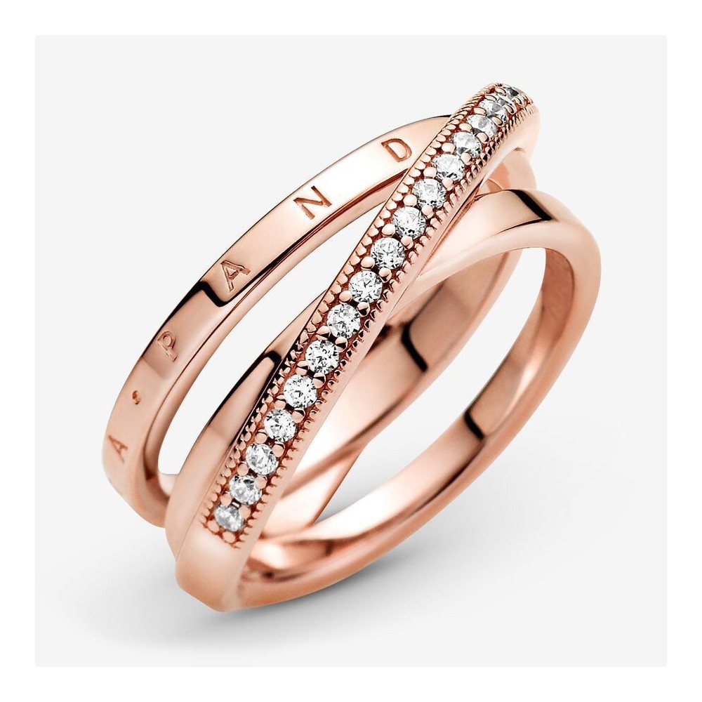 Punta sugli strati lineari indossando questo anello con tripla fascia intrecciata e pavé. Rifinito a mano e realizzato con placcatura in oro rosa 14k, l’anello presenta tre fasce, una delle quali si sovrappone in diagonale alle altre due. La prima fascia interna è decorata dal logo Pandora, l’altra fascia interna è lucida, mentre la fascia esterna è decorata da un pavé di pietre di zirconia cubica incolori incorniciato da micro-sfere. Ispirato all’ipnotica struttura del sistema solare, l’anello infonde sofisticata eleganza a ogni look..