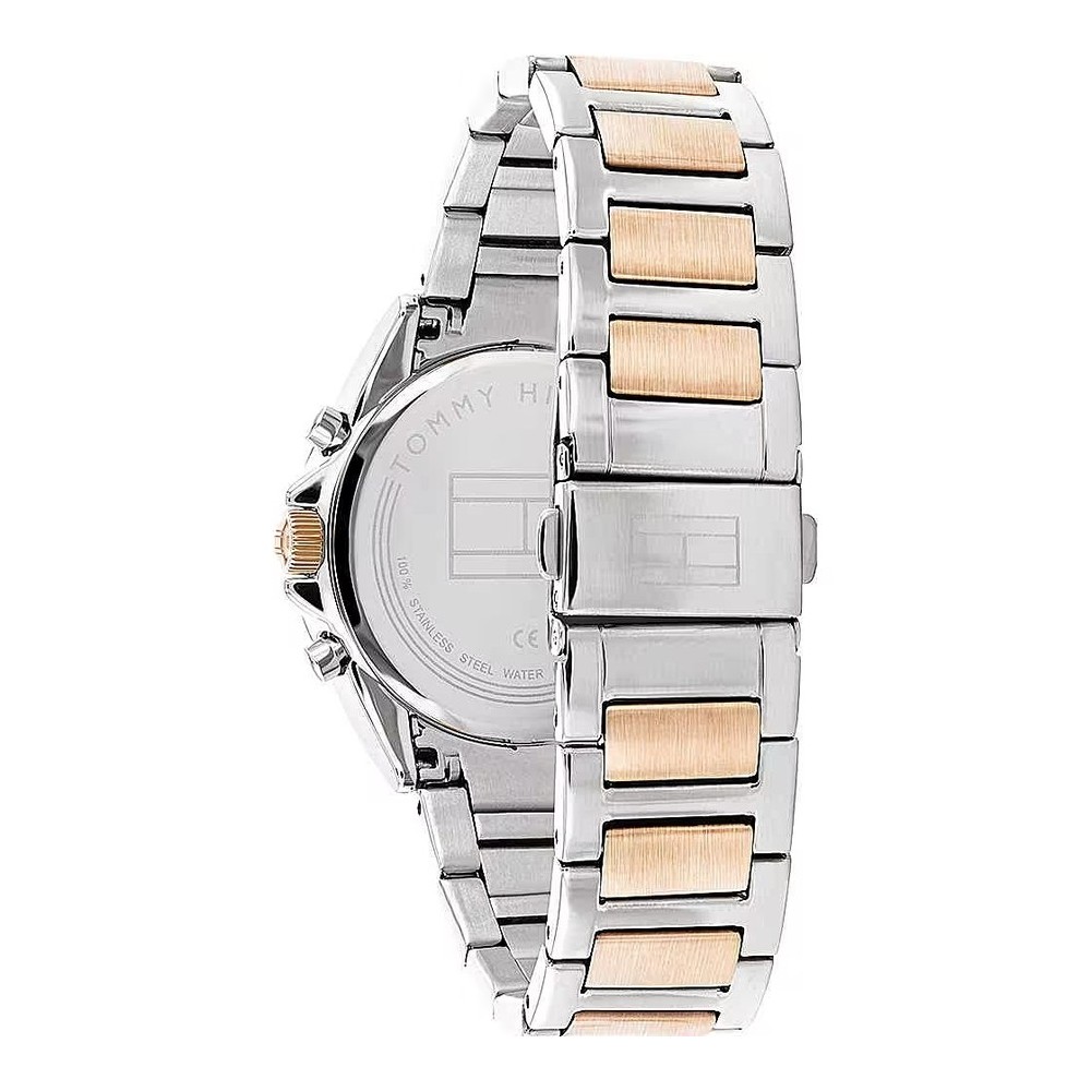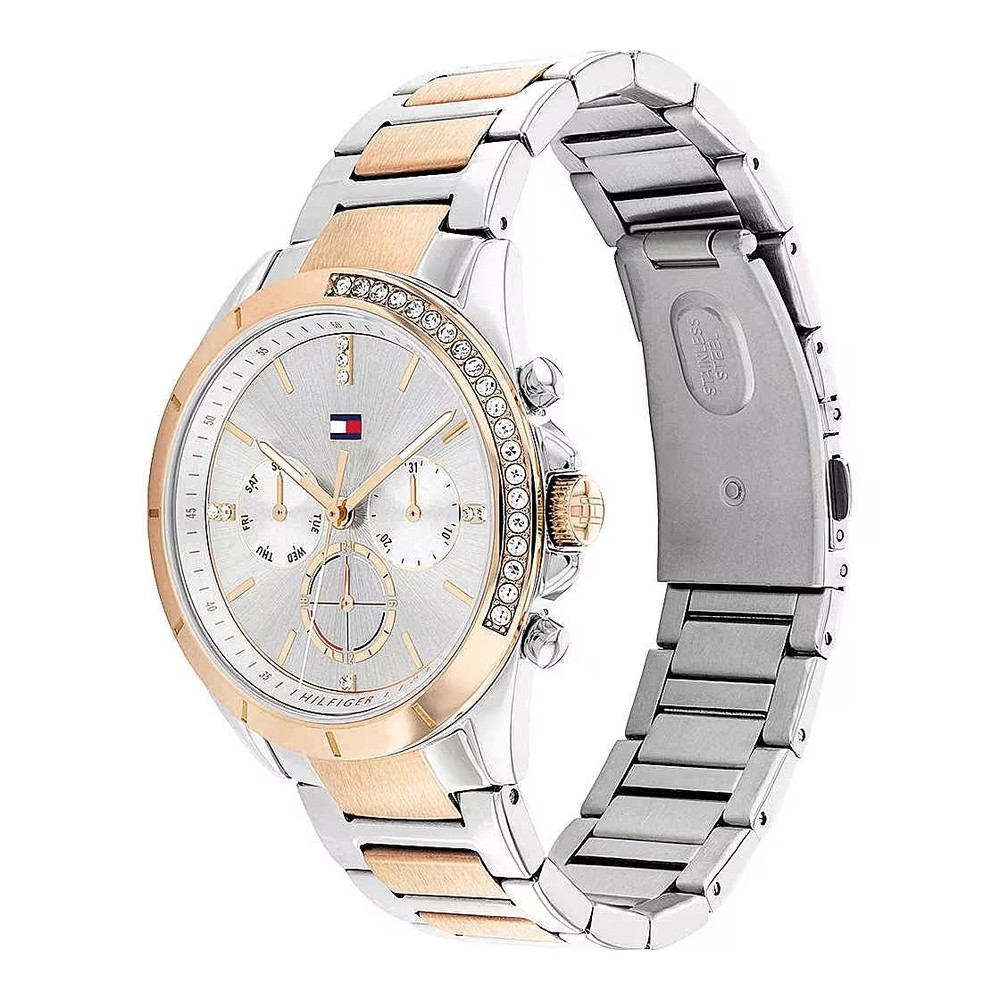 Orologio multifunzione da donna di Tommy Hilfiger della collezione kennedy. La cassa è in acciaio placcato oro rosa e cristalli, rotonda, di colore acciaio di colore oro rosa con cristalli, misura cassa: 38mm. Il quadrante è di colore grigio e il vetro è minerale. Il cinturino è in acciaio, di colore argento e rosa. Orologio multifunzione. La resistenza all'acqua è di 5 atm. La referenza è 1782387Questo articolo verrà spedito con Scatola Originale Tommy Hilfiger se prevista dal brand